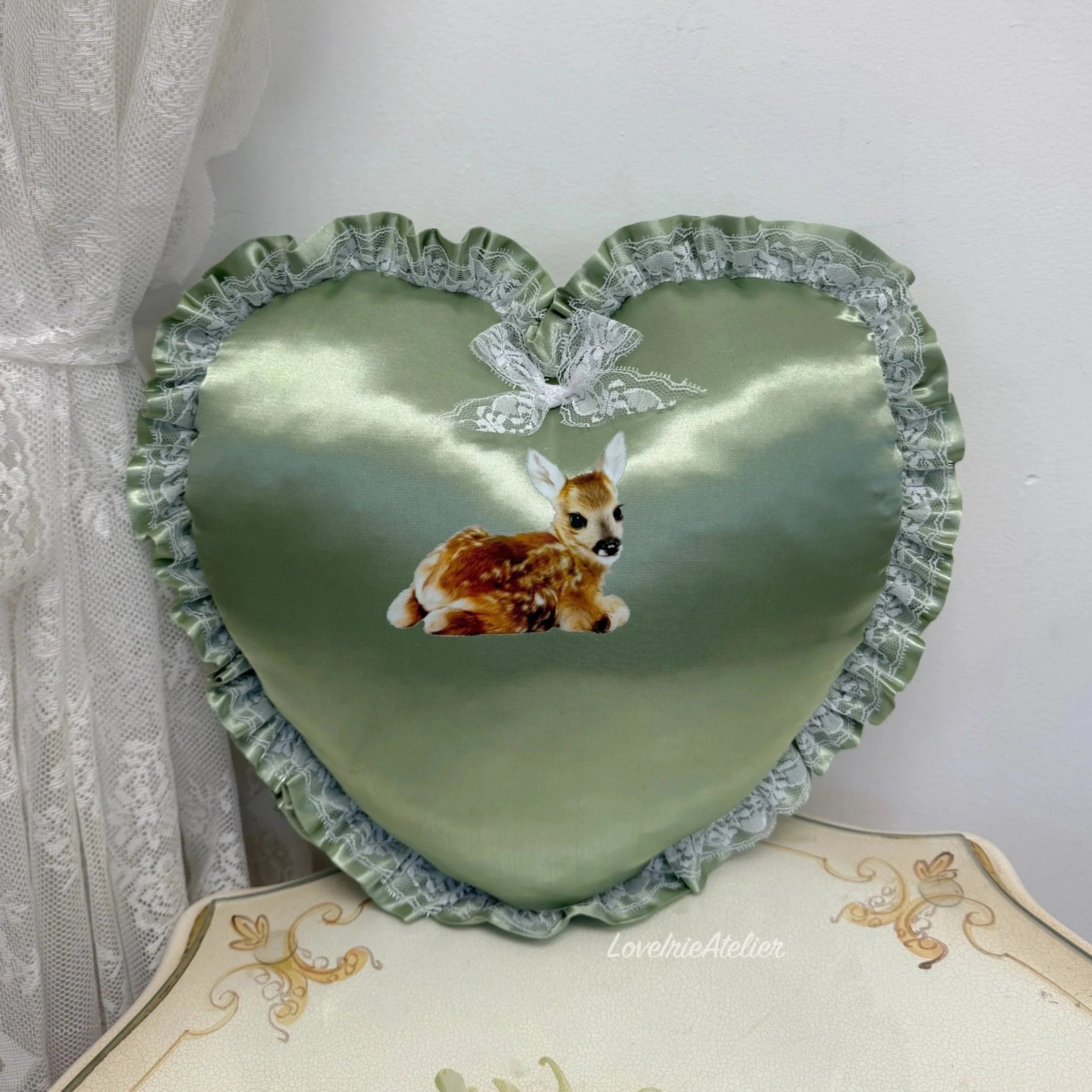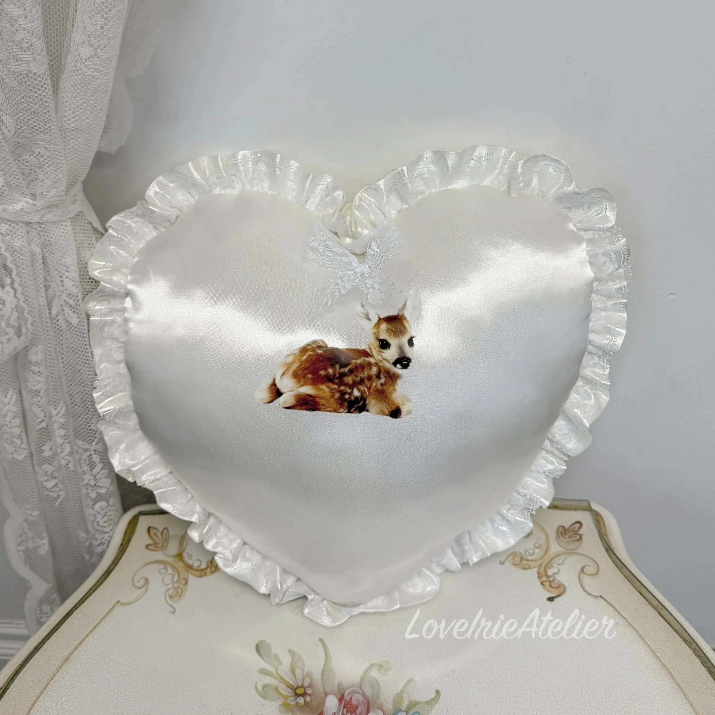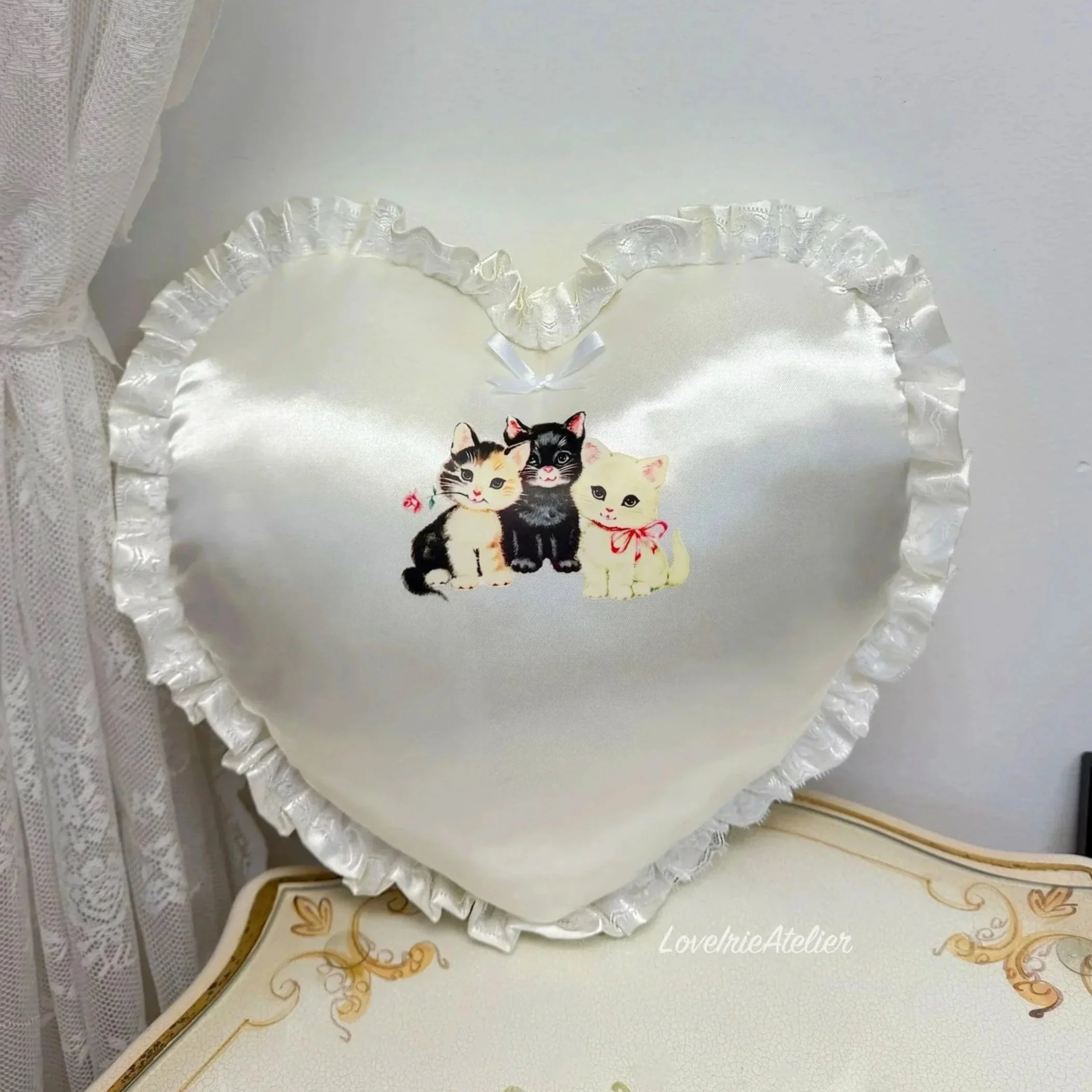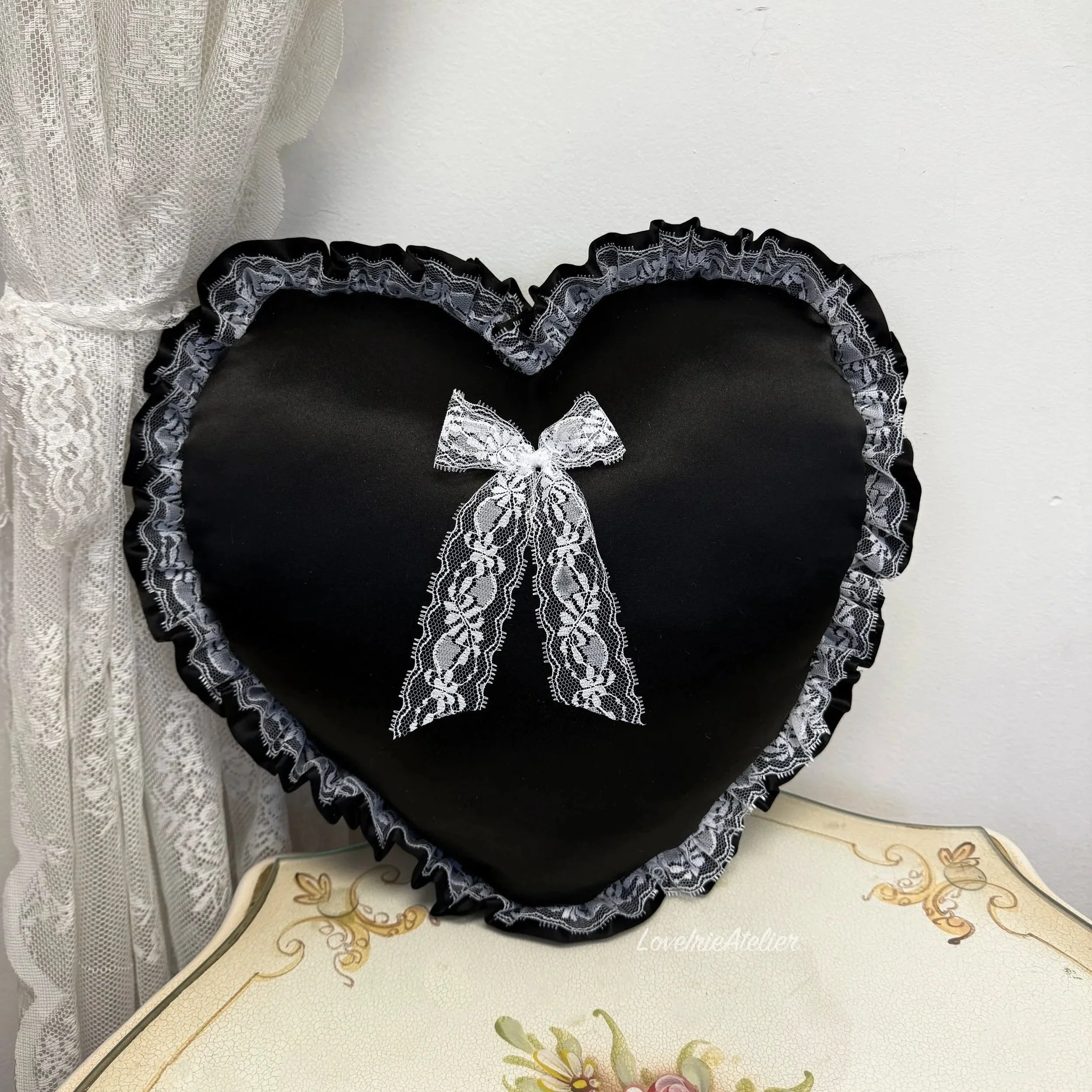 This heart-shaped throw pillow is a romantic, feminine accent designed for coquette rooms, shabby chic bedrooms, and softly vintage-inspired interiors. Crafted in smooth satin and finished with delicate lace detailing, it brings texture, charm, and a timeless, nostalgic feel to any space.